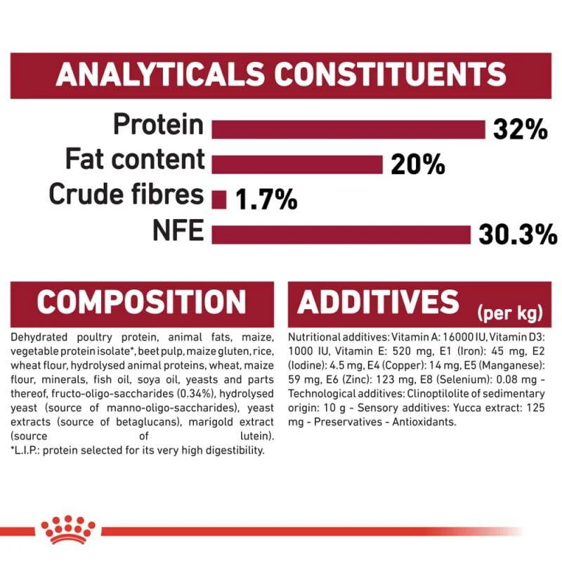 پروتئین مرغ خشک شده، ذرت، چربیهای حیوانی، تفاله چغندر، پروتئینهای گیاهی ایزوله شده، گلوتن ذرت، پروتئین گوشت خشک شده، برنج، آرد گندم، پروتئینهای حیوانی هیدرولیز شده، گندم، آرد ذرت، روغن ماهی، روغن سویا، مخمر، عصاره گل همیشه بهار، ویتامینها، مواد معدنی و آنتیاکسیدانها |