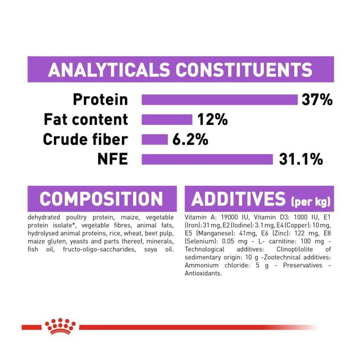 پروتئینهای موجود در غذای خشک گربه استرلایز شامل پروتئین خشک مرغ، پروتئینهای حیوانی هیدرولیز شده و پروتئینهای گیاهی ایزوله شده هستند. این ترکیب باعث حفظ توده عضلانی، تقویت عضلات فک و تشویق گربه به جویدن میشود.
