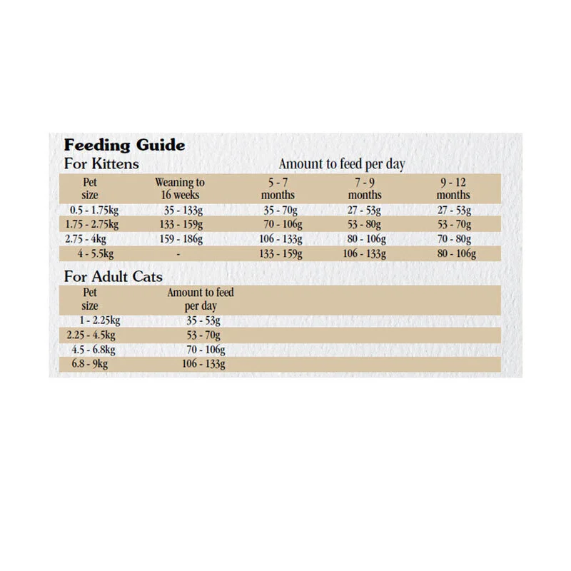 • گربه‌های بالغ: روزانه بین ۶۰ تا ۸۰ گرم بسته به وزن و فعالیت توصیه می‌شود.