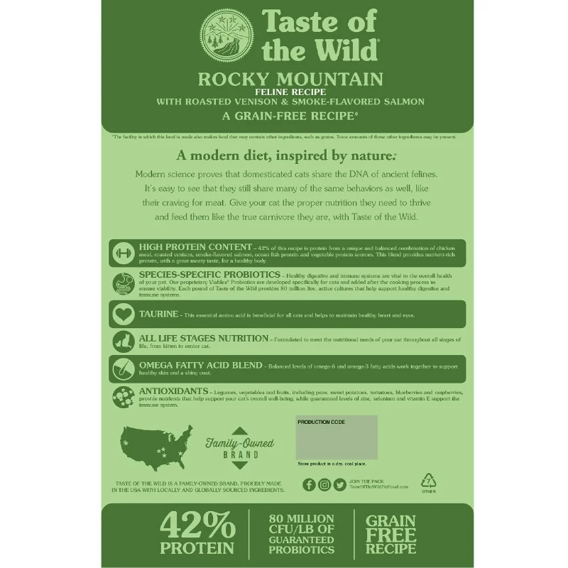 این محصول توسط برند آمریکایی Taste Of The Wild تولید شده و استانداردهای بالای کیفی و تغذیه‌ای را رعایت می‌کند.